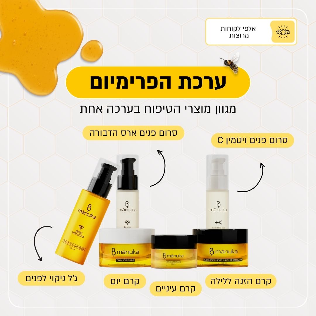 המוצרים של BEMANUKA מבוססים על חומרים טבעיים ועוצמתיים שנמצאו כאלטרנטיבה טבעית ובריאה להזרקות וטיפולים פולשניים. רכיבים כמו דבש מנוקה וארס דבורים, בשילוב עם חומצה היאלורונית, יוצרים נוסחה שמזינה את העור, מגבירה לחות ומשפרת את מראה הקמטים והקמטוטים – כל זאת מבלי לפגוע בבריאותך.למי זה מתאים?לנשים שמחפשות לשמור על עור בריא וזוהר ללא התערבות פולשנית. אם את מעדיפה טיפוח טבעי ובריא, המארז הזה הוא הבחירה המושלמת עבורך.